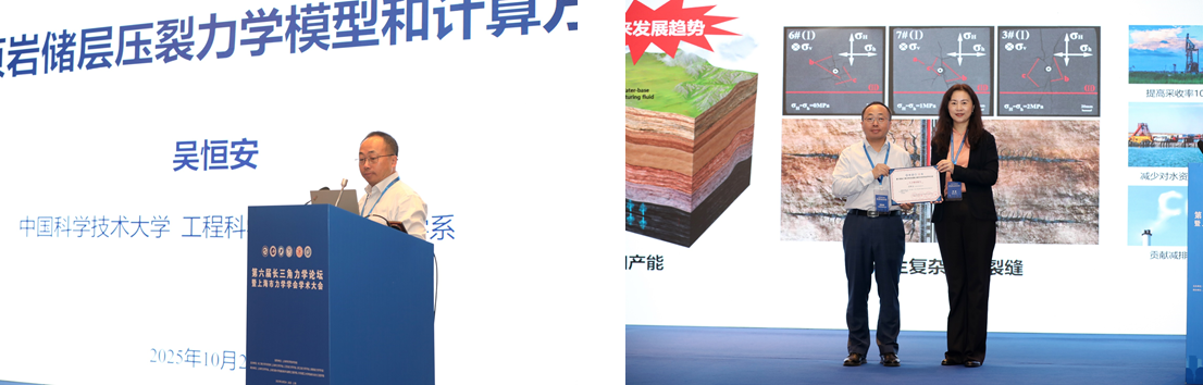 吴恒安教授的题为“陆相页岩储层压裂力学模型和计算方法”报告中提出了统一的非均质页岩水力压裂理论模型,给出了界面作用下裂缝尖端的渐近解,揭示了不同层厚页岩中裂缝扩展的时-空演化规律;通过建立该渐近解与三维裂缝前沿位移场的映射关系,结合显-隐式裂缝捕捉算法实现了陆相页岩工程尺度下水力裂缝形貌的快速精确求解。第一段大会报告由李岩教授主持。